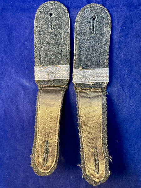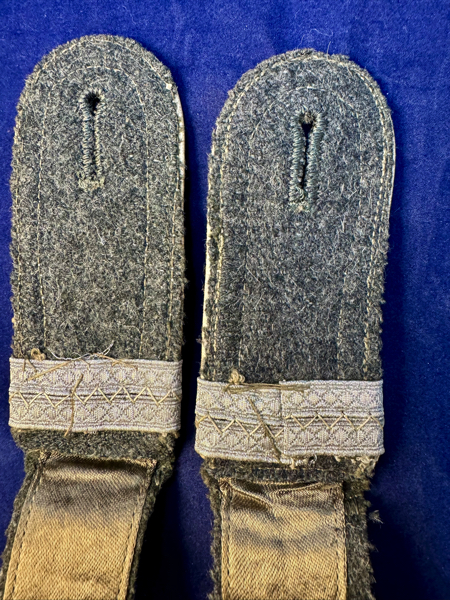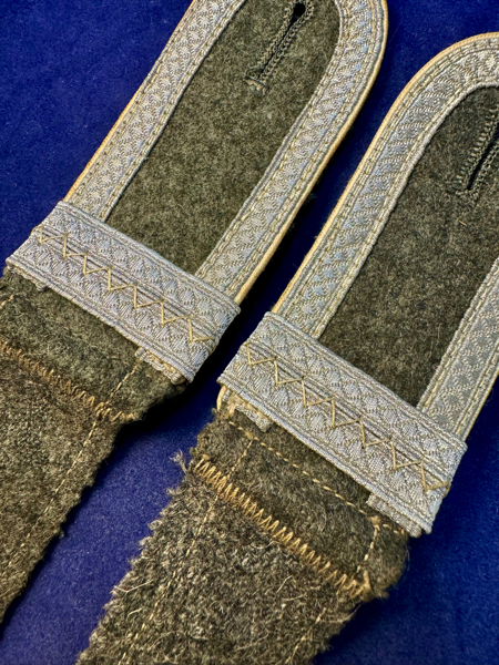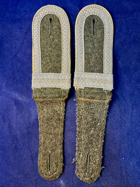 Excellent matches set of Army NCO Slip On shoulder boards. Bright silver tress around the boards with White rayon piping. There are double bands of Officer Candidte tress sewn to the back edge. The base is field grey / green wool with the tongues lined in artificial silk. Excellent set!!