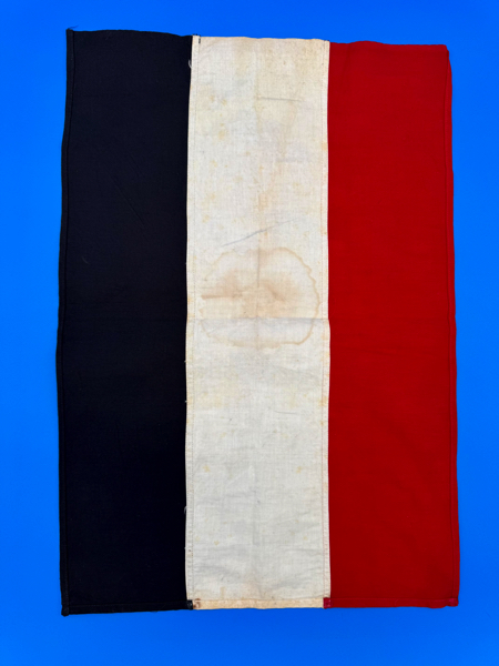 Nice looking German Tri-Color Flag in three piece construction. This great display size banner measures 20 1/2" X 14" and made in heavy cotton. Very light soiling and overall in great condition!!