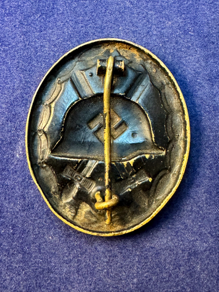 Nice early Wound Badge in Black made from Stamped Brass. Fine looking badge with the brass showing through in parts of the wreath and the Swastika. The back is complete with its hardware and this is an unmarked example.