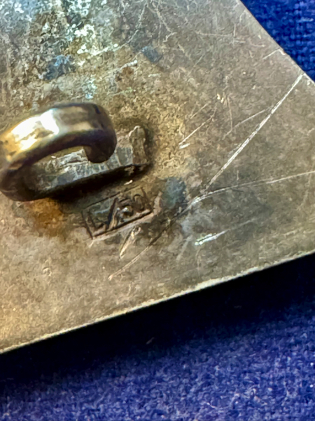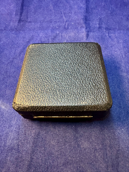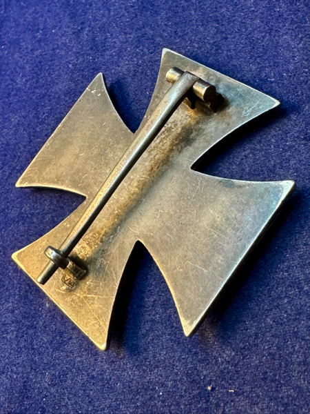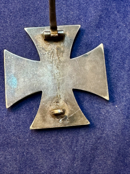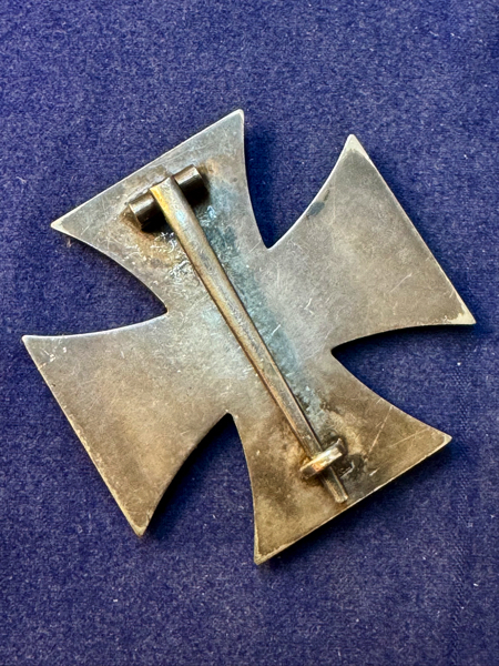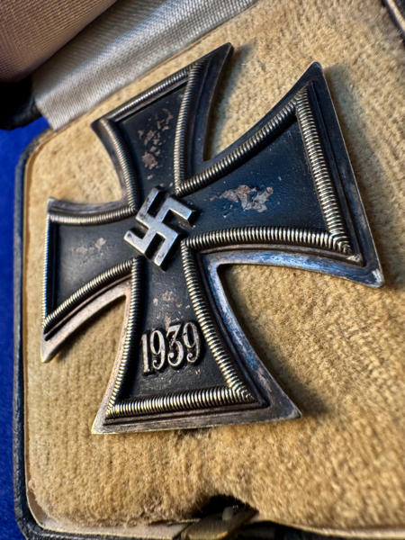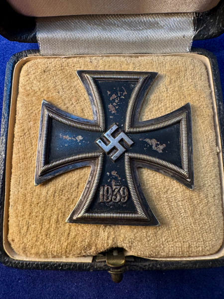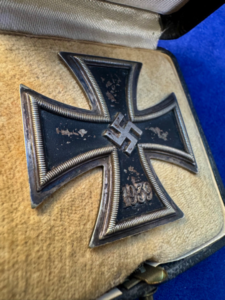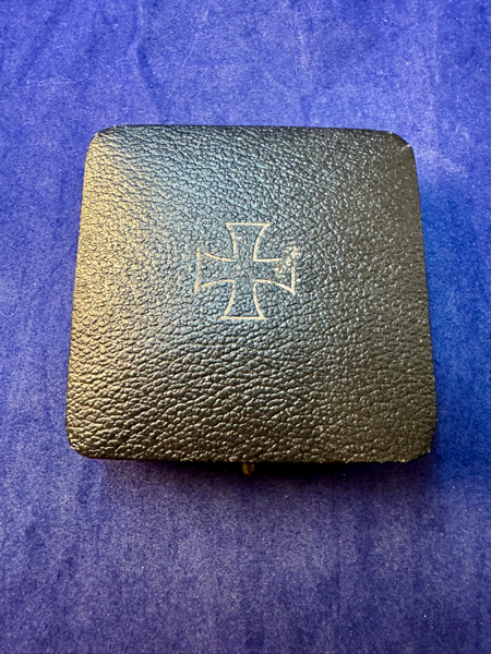Very nice High Quality made Iron Cross First Class by GODET. Three piece construction with the silver frames having a nice even patina. The magnetic painted core shows some finish loss to each arm and the Swastika. The detail is very crisp and the Swastika a very high relief. The back is complete with its hinge, tapered pin and catch. Maker marked L/50 just under the catch for GODET. Very hard example to find!! The case is in great shape with no real issue. The base and white satin lid material is complete. There is minor wear to the Iron Cross motif on the lid but otherwise a very sound case. Very nice set!!!!