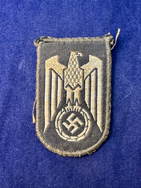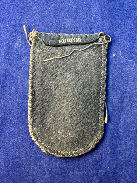 Beautiful, tunic removed example of the 1935 Pattern Red Cross Sleeve Eagle. Bevo construction and mounted to a grey wool backing. Nice large insignia measuring 60 mm high and 38 mm wide. Ges Gesch can be seen on the back of the folded over tab. Great example!!
